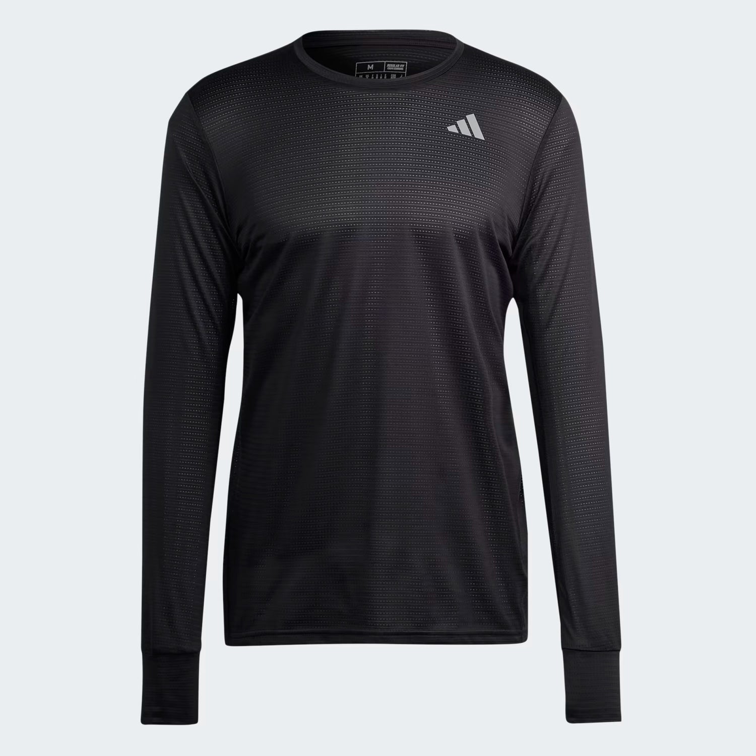 When your weather app tells you a short sleeve is not going to cut it for today's run, reach for this adidas t-shirt. Its classic crewneck fit and polyester build make it a staple in every runner's wardrobe. Slip your thumbs into the holes in the cuffs, and your hands will stay the perfect temperature. Moisture-managing AEROREADY helps keep you dry, and when it starts to get darker earlier, reflective details shine in low light. Wear it alone or as a layer, and you're good to go.