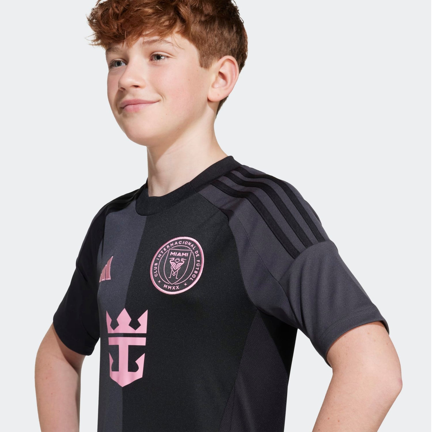 Bring Miami style to the stadium in this juniors' Inter Miami CF away jersey from adidas. With pink details popping against a black and carbon half-and-half design, this supporter shirt exudes sophistication. Its moisture-managing AEROREADY and soft fabric are there to keep fans comfortable. A club sign-off and sewn-on crest show you appreciate first-class soccer. This product is made with 100% recycled materials. By reusing materials that have already been created, we help to reduce waste and our reliance on finite resources and reduce the footprint of the products we make.